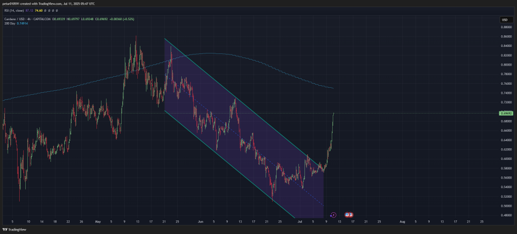 卡尔达诺(ADA)近日实现大幅上涨,单日涨幅高达12%,成为当前市场中表现最亮眼的加密货币之一。在经历数周缓慢下跌后,ADA成功突破下降趋势线,开启新一轮上涨。交易员正密切关注这轮行情能否持续——抑或仅是短期反弹。