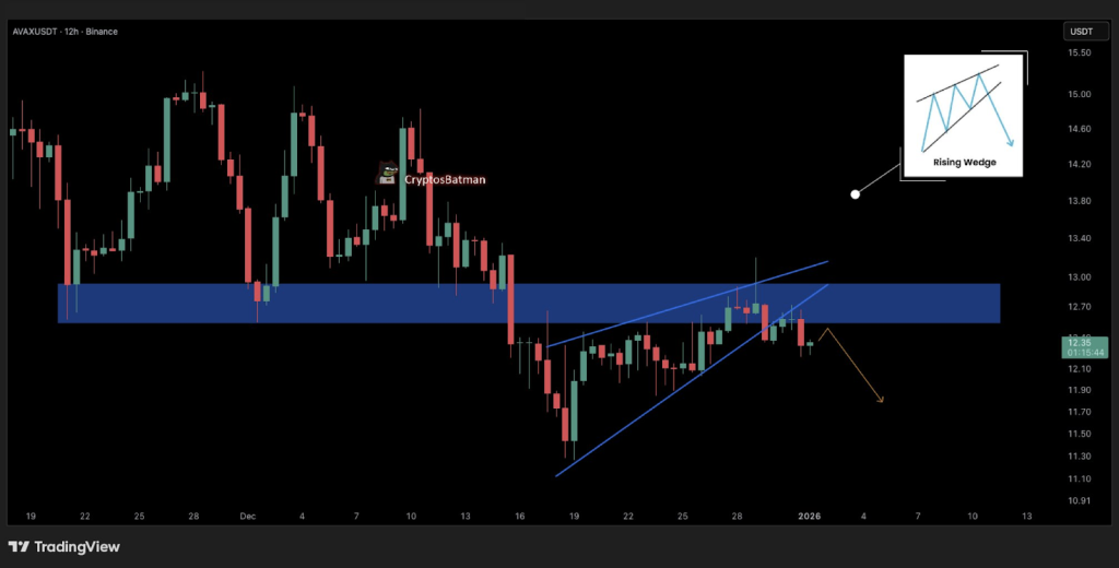 AVAX从12美元支撑位反弹,多头坚守关键水平并寻求向上突破。尽管价格处于关键支撑区上方,但看涨楔形形态发出警示信号。AVAX目标位看向26美元,但仍需突破确认和强劲成交量配合。