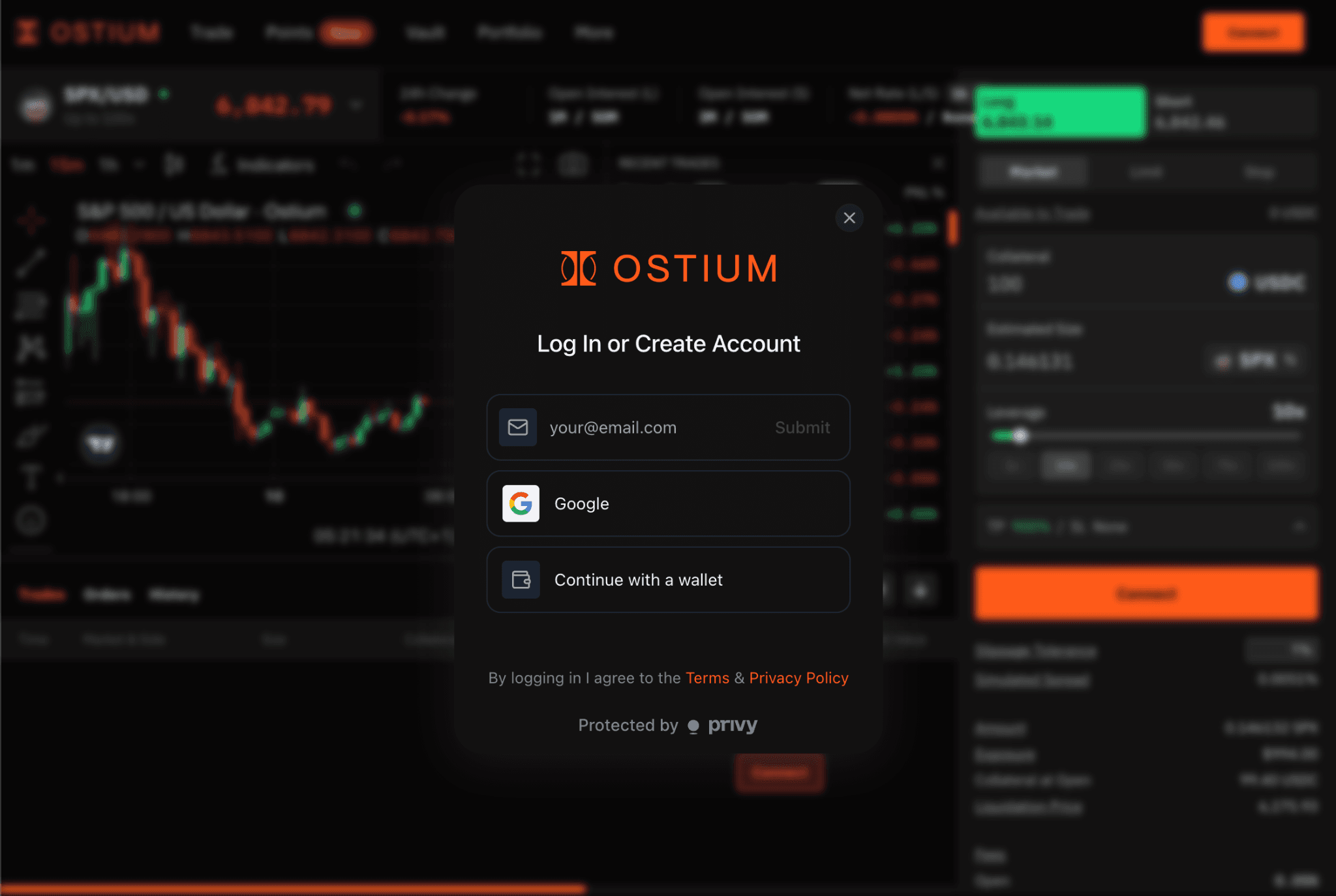 步骤1:设置钱包。如果您还没有钱包,可以使用Ostium的电子邮件注册来获取一个免Gas费的多方计算钱包。对于高级用户,可以通过app.ostium.io上的应用程序连接像MetaMask、Rabby或Coinbase Wallet这样的EVM兼容钱包。