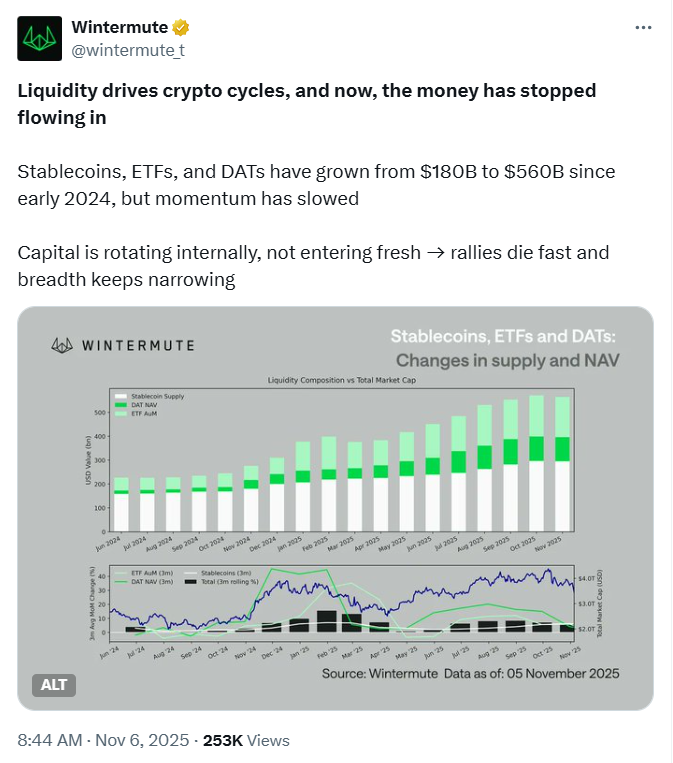 观察人士指出当前形势凸显加密货币对稳定流动性的依赖——若无新资金流入,即便优质项目也难以维持涨势。Wintermute的预警揭示核心问题:在更强资金流回归前,市场可能持续停滞。交易者正密切关注新资金入场时机,这或将触发下一轮重大行情。