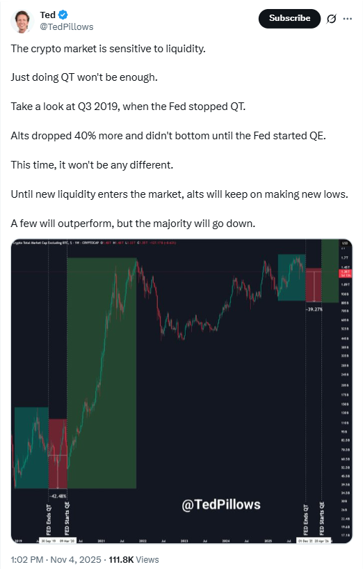 分析师认为若无新资金注入,加密货币可能持续承压。市场观察员Ted Pillows将当前形势与2019年美联储暂停量化紧缩时期类比:当时山寨币暴跌40%,直至美联储重启流动性注入才复苏。他警告若资金流未及时回归,多数山寨币可能延续跌势,仅少数项目能逆势上涨。