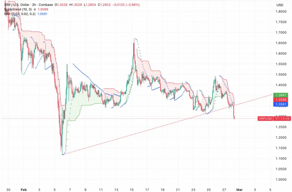 在两小时图上,XRP跌破了自2月低点1.15美元附近以来一直支撑价格走势的上升趋势线。超级趋势指标在1.35美元转为看跌,抛物线转向指标亦在同一水平发出信号,强化了该位置的阻力。
