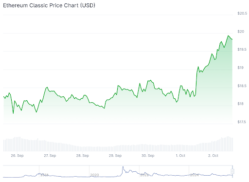 10月1日ETC从18.3美元快速拉升近20美元,伴随成交量显著放大,显示市场新资金入场意愿强烈。从技术形态看,此次反弹可能开启新的艾略特波浪周期,特别是最具爆发力的第三浪阶段。但需注意,若跌破17美元支撑位,则看涨预期将失效。