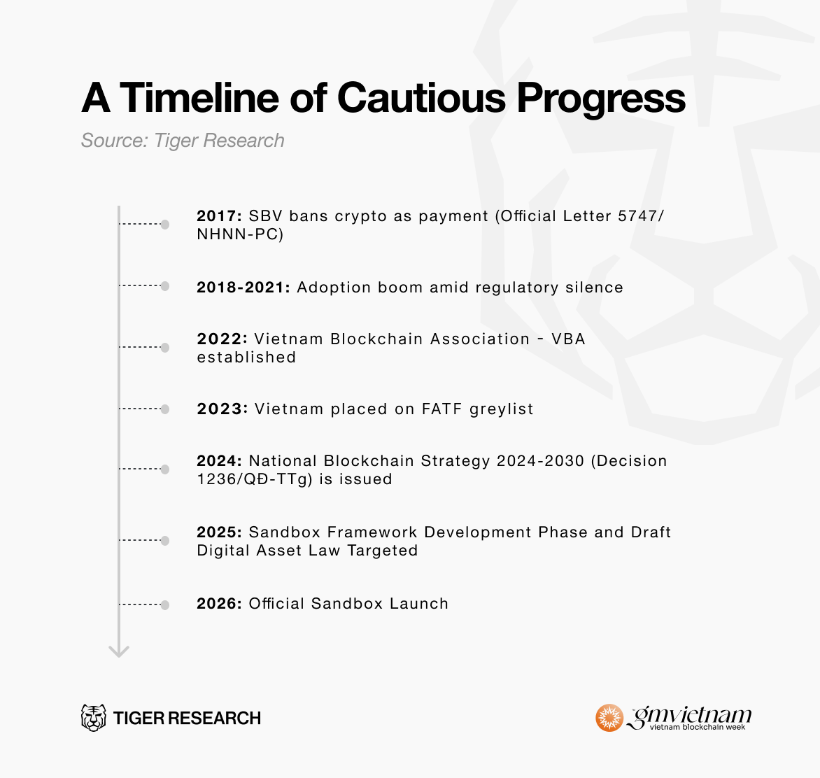 越南对加密货币的监管立场历来谨慎。虽然允许持有和交易加密资产,但加密货币不被视为法定货币,且自2017年起禁止用于支付。这形成了一个监管“灰色地带”—加密交易广泛存在但不受监管。然而,这一立场正在转变。政府已开始朝正式监管框架迈进,自2021年起出现监管发展和试点计划的迹象。