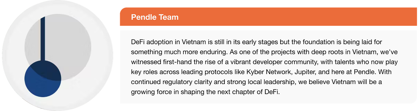 - 越南诞生了Pendle和Kyber等全球受尊敬的DeFi项目,证明本地建设者能够引领创新,尽管用户教育和信任仍在发展中。