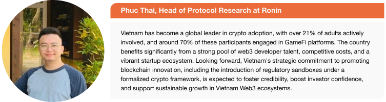 - 越南年轻、精通技术且以移动端为主的用户群体,加上全球领先的加密货币采用率,使其自然成为东南亚地区Web3早期采用和创新的引领者。