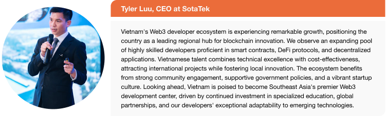 - 越南拥有东南亚最大的科技人才库;通过加强区块链教育,其开发者群体有望成为该地区最有能力的Web3劳动力之一。