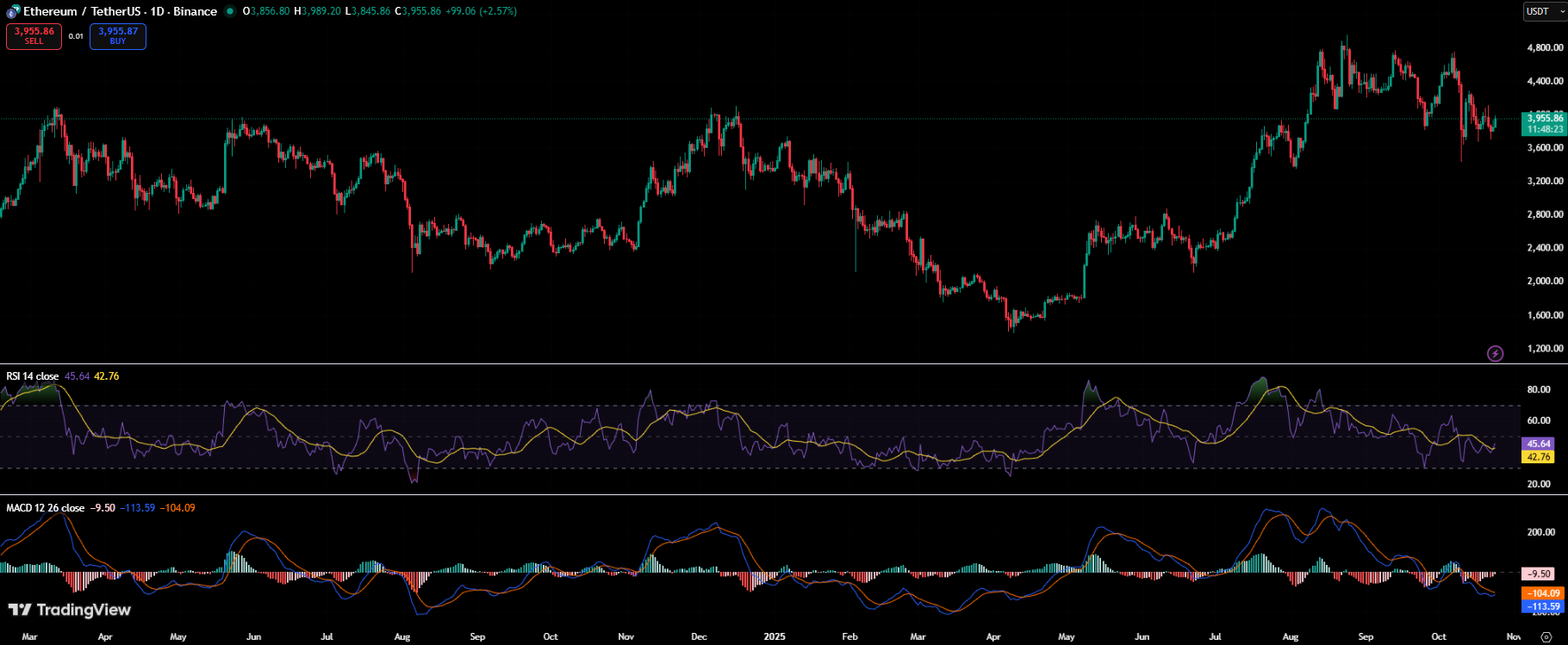 技术面显示,以太坊日线RSI维持在45附近,表明在进入超买区间前仍有上行空间。同时MACD指标初显空头动能平缓迹象。若ETH能站稳4000美元上方,交易者预计将获得更明确的技术面确认信号。