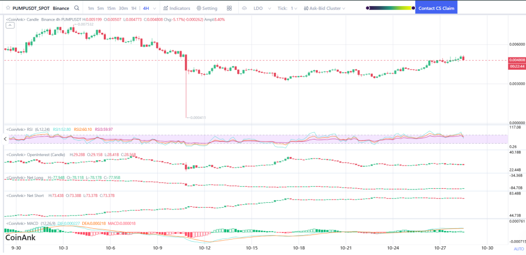 反之,若突破失败,需关注0.0041美元支撑区——该区域已两次验证有效性。失守将延缓看涨结构,或引发新一轮整理。但当前市场情绪更为乐观:回购缩减供给、巨鲸持续吸筹、技术指标改善配合四小时图的稳健结构,PUMP价格进入十一月的态势较过去三周任何时点都更具优势。