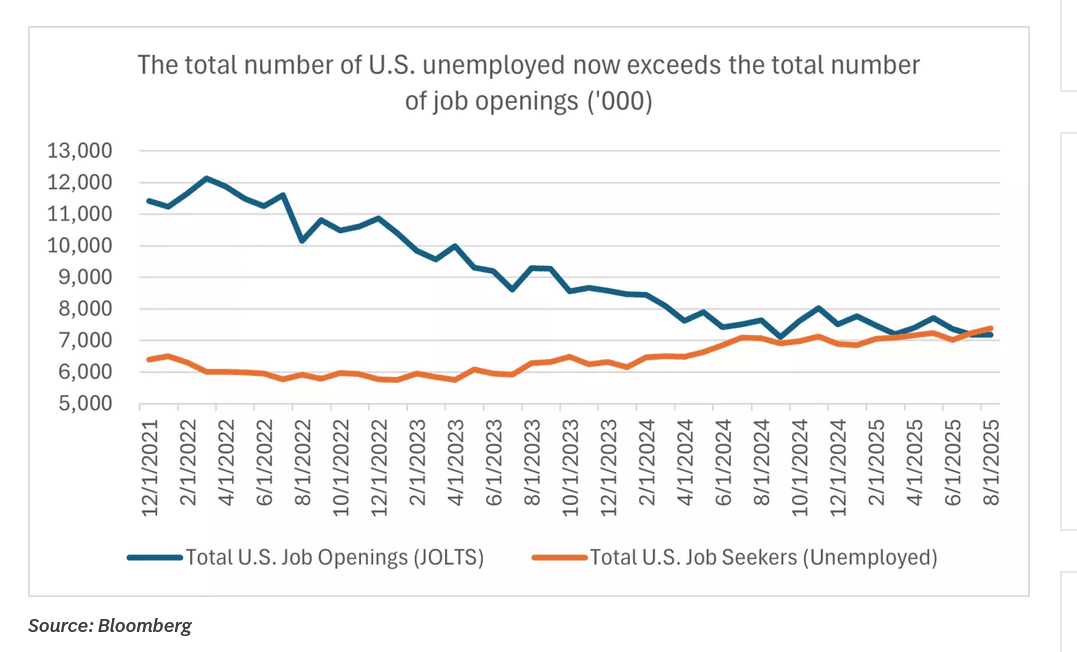 最新非农就业数据清晰描绘了劳动力市场降温的图景:8月仅新增2.2万个岗位(预期7.5万),失业率升至4.3%,创2020年以来最弱就业环境。职位空缺数年来首次低于失业人数,显示雇主正主动收缩招聘规模。