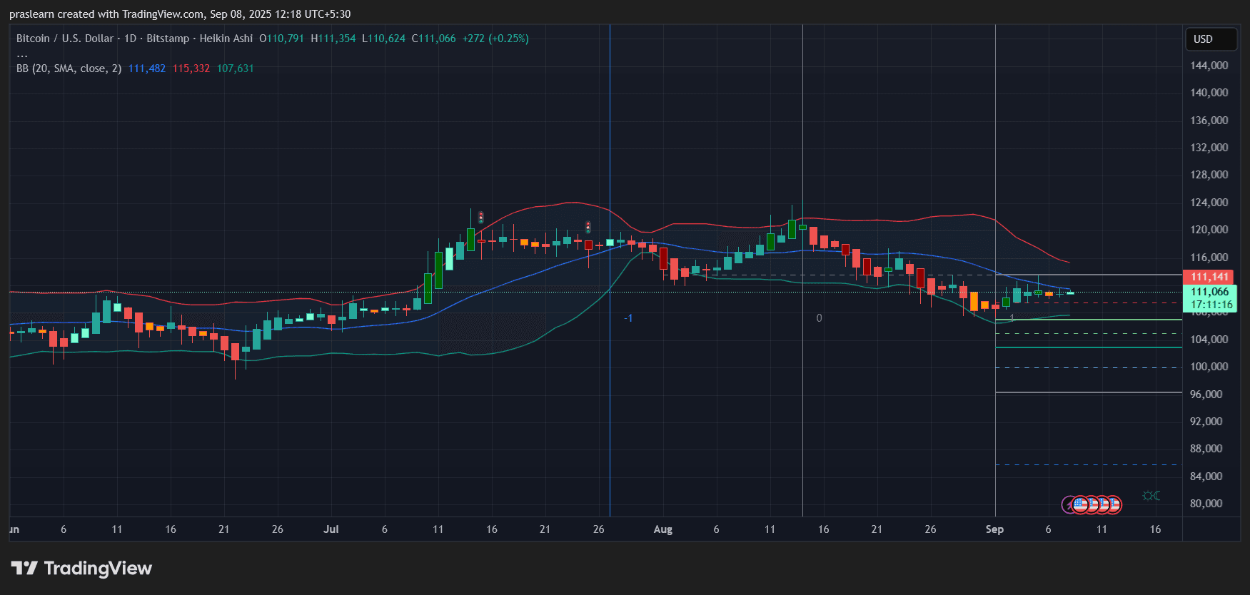 BTC/USD日线图显示,价格在经历从7月中旬12万美元高点的长达一个月的回调后,目前企稳于11.1万美元上方。布林带收窄表明波动性降低,上轨(11.53万美元)构成阻力,下轨(10.76万美元)形成支撑。近期K线显示买盘正在捍卫下轨,但20日均线(蓝线)仍呈下行趋势,表明市场尚未完全转向多头格局。