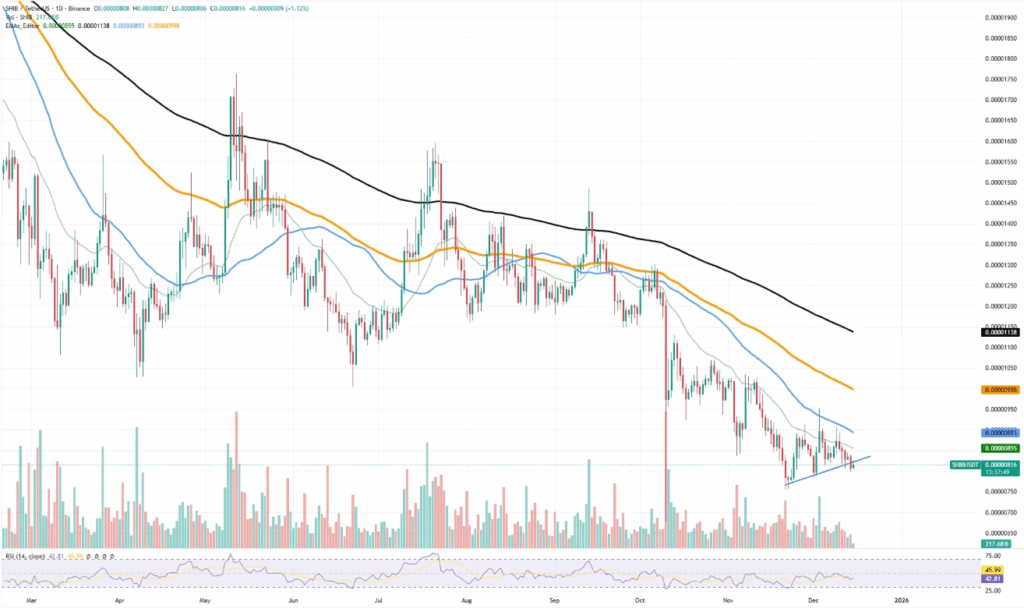 近期SHIB低点形成的市场结构呈现浅幅上升基底,构成典型收敛形态。虽非立即看涨信号,但表明资产并未自由落体式下跌。RSI在40低位徘徊暗示卖压正在消退,不过买盘兴趣仍然低迷。