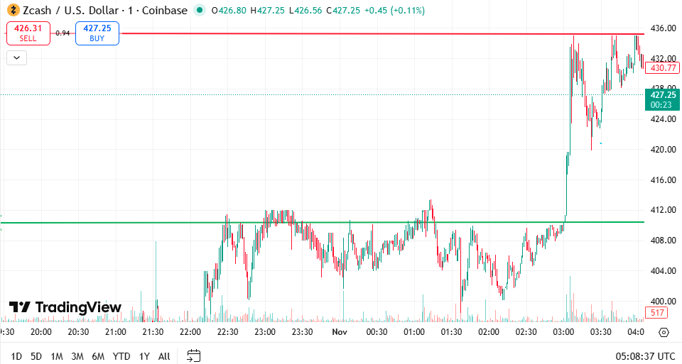 据TradingView数据显示,目前Zcash交易价格约为427.25美元,24小时交易量突破13.8亿美元,市值约71.6亿美元。该代币在10月的表现堪称惊艳,单月涨幅近200%,而同期整个加密市场下跌约4.5%。