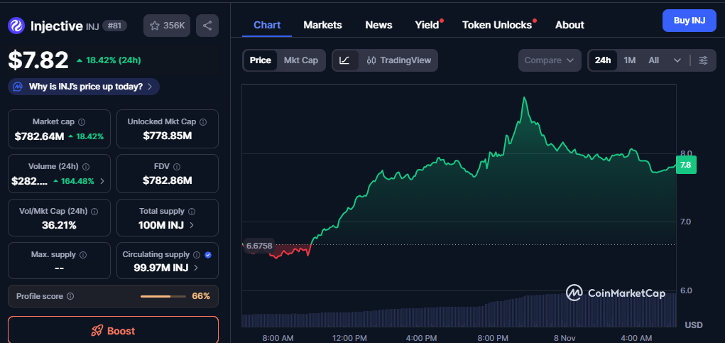Injective Protocol($INJ)展现出强劲上涨势头,过去24小时内价格上涨18.42%至7.82美元。该加密货币受益于市场活跃度提升,目前正在测试关键阻力位。