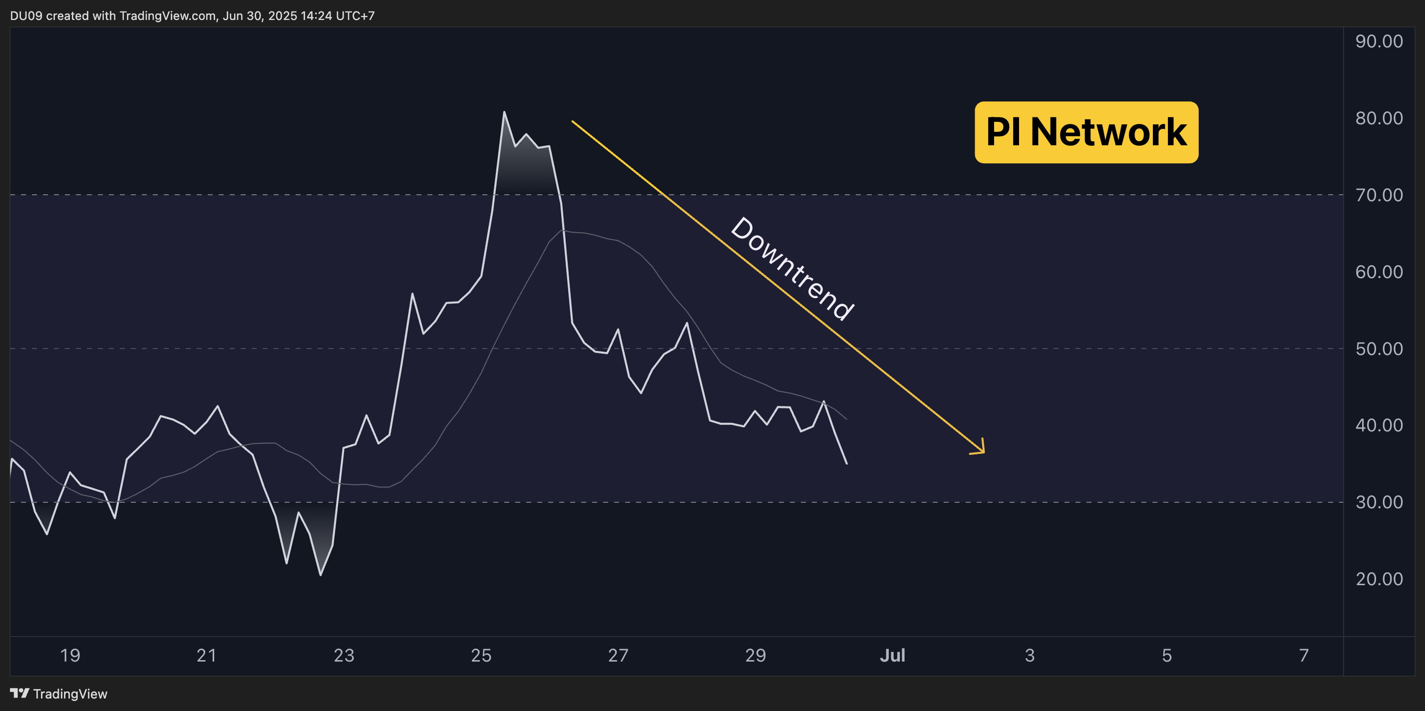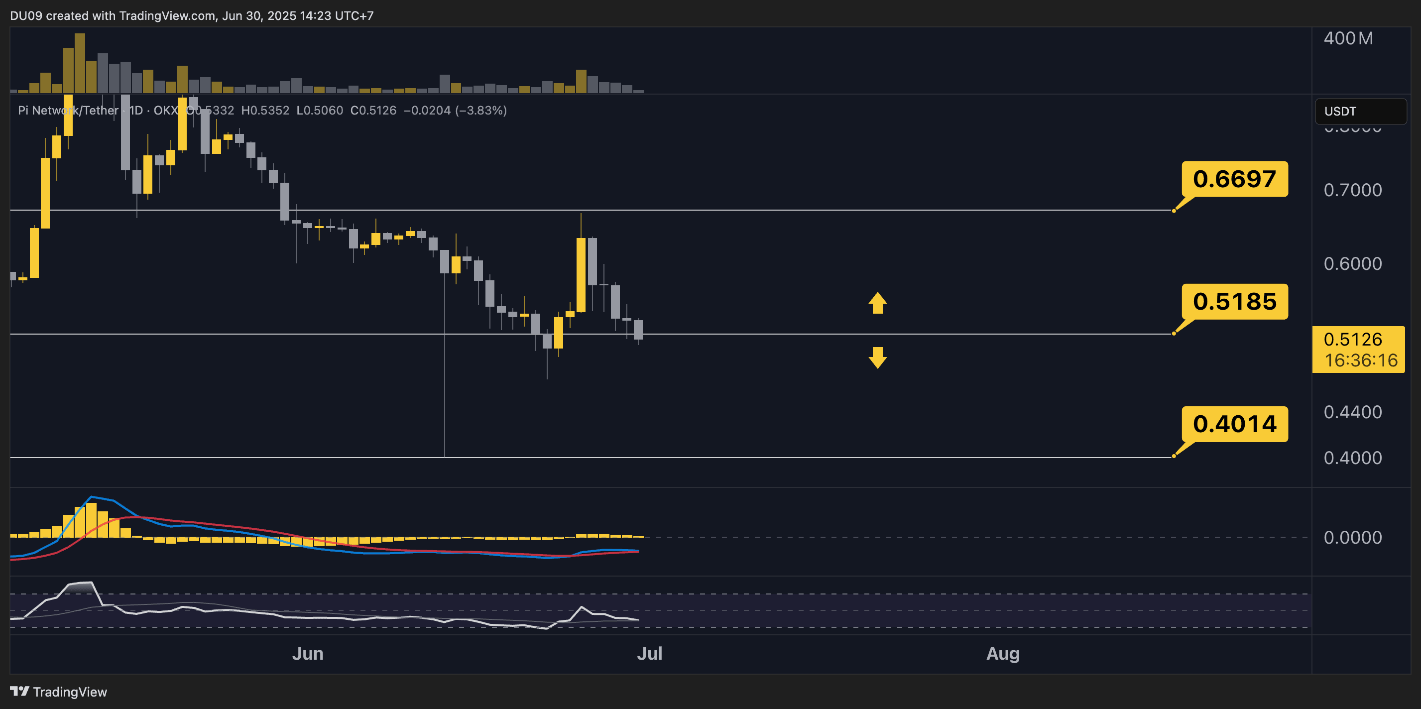 尽管买家曾试图通过强劲反弹至67美分来阻止当前下跌趋势,但卖方迅速反扑并完全回吐近期涨幅。这一看跌信号导致价格目前徘徊在0.50美元关口附近。若该关键心理价位失守,PI可能再创新低。