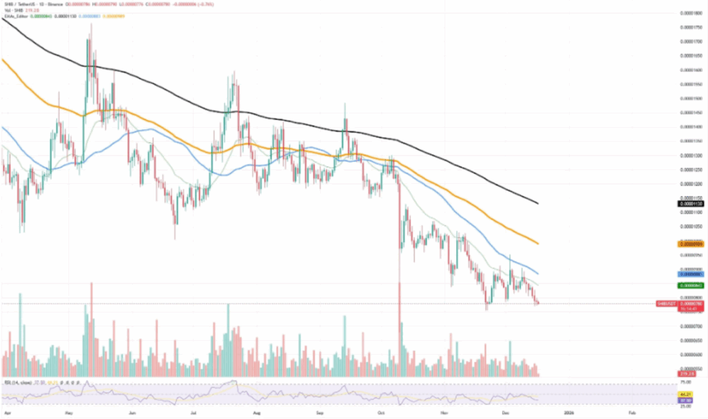 柴犬币价格在急剧下跌后显现企稳迹象,但仍处于关键移动平均线下方