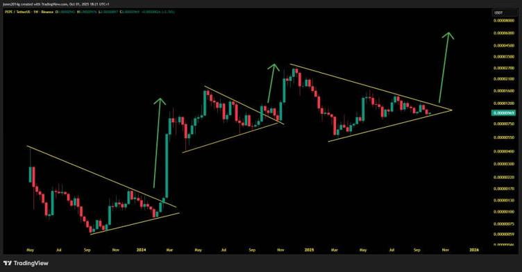 市场观察员HaileyLUNC在X平台强调,Pepe正在"如蓄势待发的青蛙般盘绕收缩"。这种伴随放量的重复突破形态,既反映零售交易者的有序参与,也彰显社区驱动的增长动能。