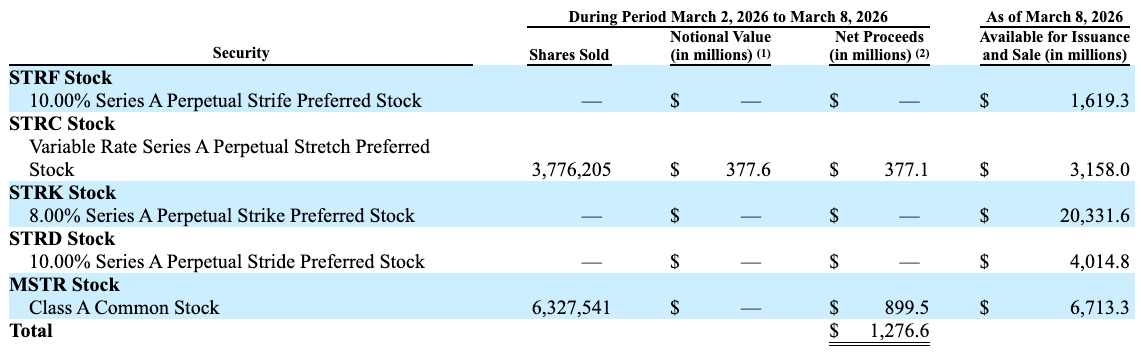 Strategy在周一提交给SEC的文件中报告,通过STRC销售筹集了约3.78亿美元。公司还报告了高达13亿美元的比特币购买,这是其有记录以来规模最大的比特币收购之一。普通股MSTR在已报告销售中贡献了最大收益,筹集近9亿美元。