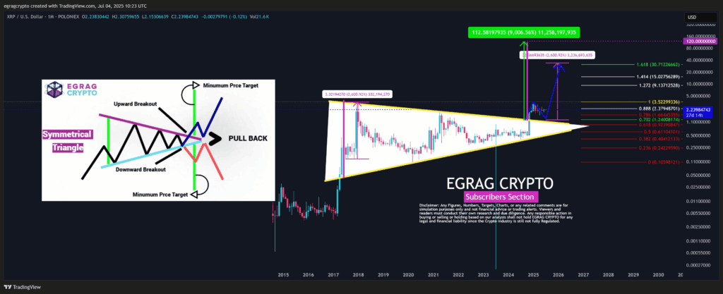 另据分析师EGRAG CRYPTO发布的技术图表显示,XRP已突破对称三角形形态,暗示可能迎来"极其漂亮"(Bellissimo)的上涨轨迹。该形态通常预示重大突破,理论最小目标位达120美元,较当前2.23美元有9,000%潜在涨幅。