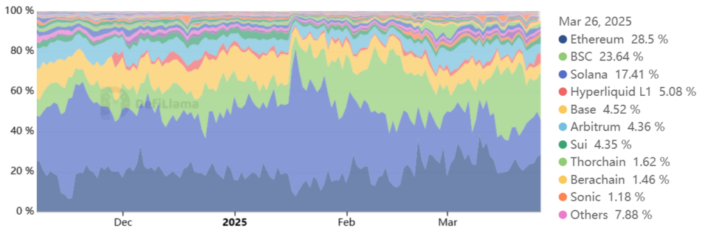 Solana曾在2024年10月至2025年2月期间主导DEX活动。最近的转变表明,交易者现在更倾向于在其他网络上进行流动性和执行交易。