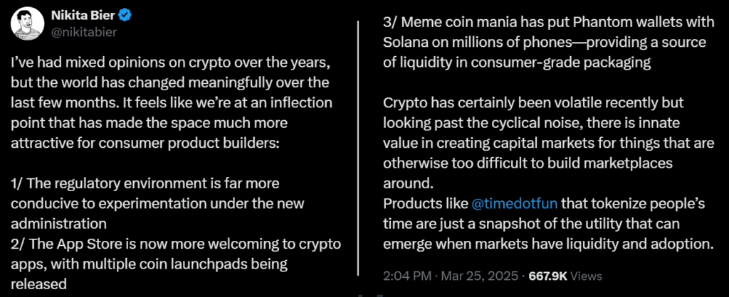 TBH和Gas的联合创始人Nikita Bier表示,Solana拥有“移动优先去中心化应用的基本构建模块”。他提到前总统唐纳德·特朗普对加密货币的友好态度,认为这对美国区块链平台是一股顺风。