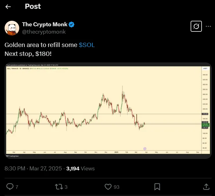 Crypto Monk则分享了更为战术性的观点,他发帖称:“补充$SOL的黄金区域。下一站,180美元!”与此同时,BATMAN指出了一次关键的技术回测,他表示:“看起来$SOL正在向黄金斐波那契水平回测。”