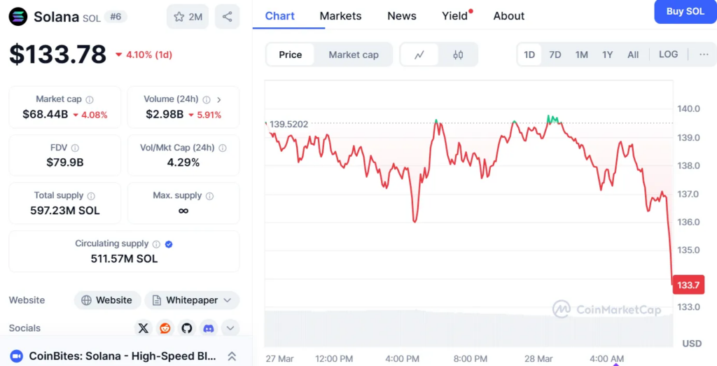 3月25日,Solana(SOL)价格在未能维持在147美元上方后,失去了看涨势头。目前,该原生代币交易价格接近137美元,较上周峰值下跌8%。