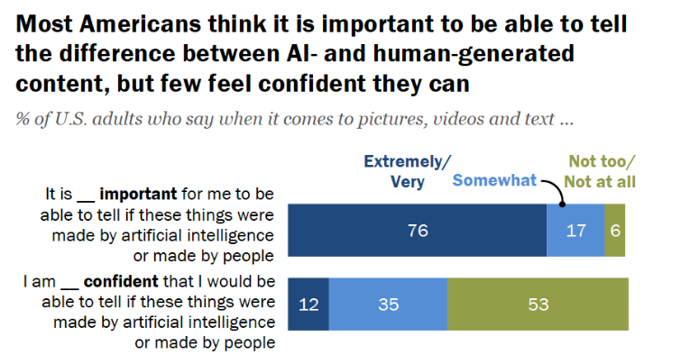 皮尤研究中心9月的一项研究发现,至少76%的美国人认为能够识别AI内容很重要,但只有47%的人自信能准确检测出。