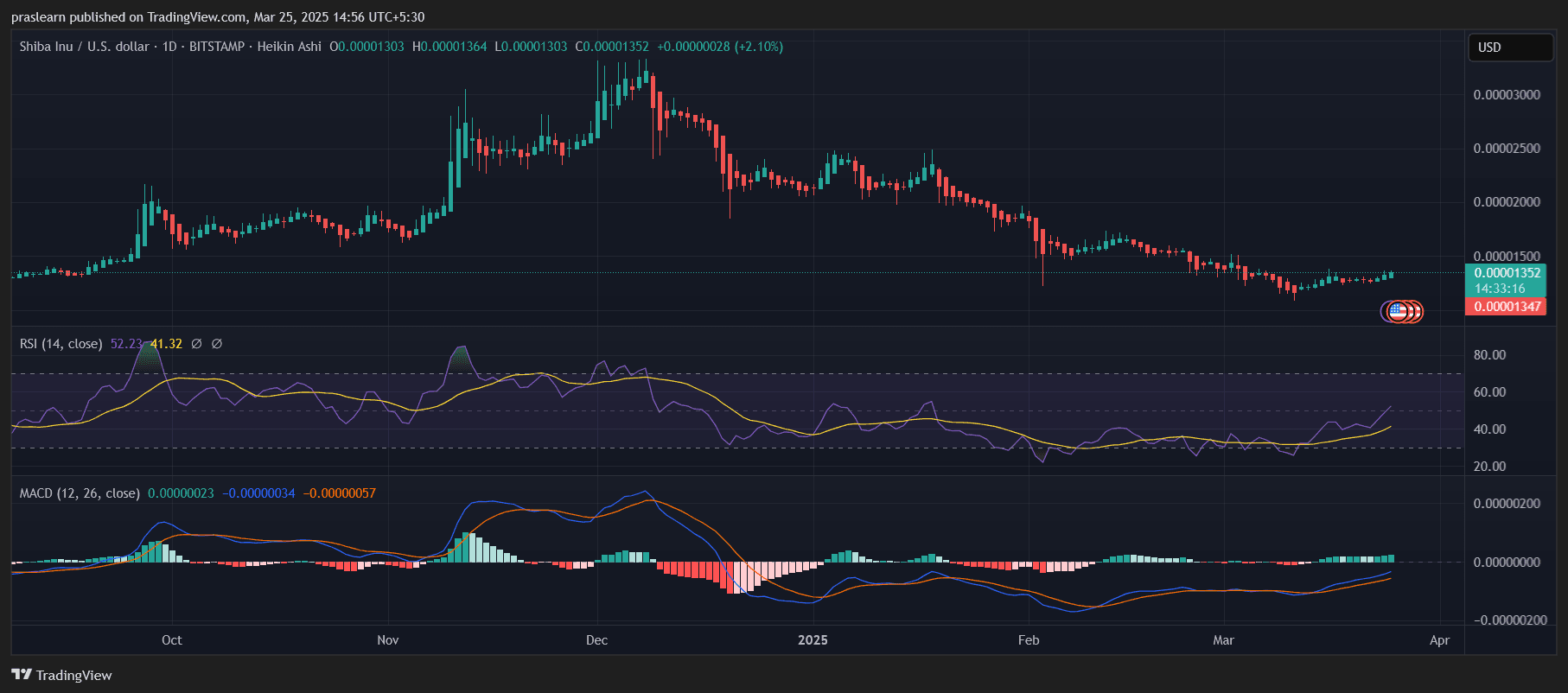 经过数月的下跌,Shiba Inu(SHIB)似乎正进入一个安静的积累阶段。日线图显示,SHIB正在形成一个微妙但充满希望的上升趋势,当前交易价格约为0.00001352美元。Heikin Ashi蜡烛图底部开始出现较小的下影线,表明卖压减弱,并预示着趋势反转的早期迹象。SHIB价格已经连续呈现绿色蜡烛,虽然涨幅不大,但显示出看涨情绪的增长。这可能是新一轮动量波的开始,尤其是如果买家继续在0.00001300美元的支撑位上方介入。