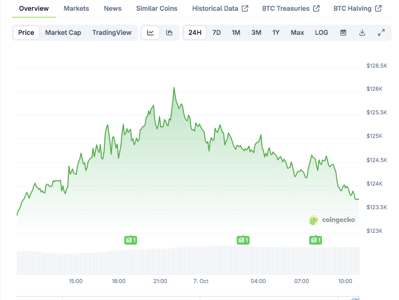 根据CoinGecko数据,比特币现报124,064美元,24小时微涨0.13%,周涨幅达8.7%。在此高价区间持续的买盘支撑了长期投资者对后市空间的乐观预期。24小时交易量约662亿美元,显示市场活跃度强劲。数小时前比特币更创下126,000美元的历史新高,进一步巩固近期强势表现。