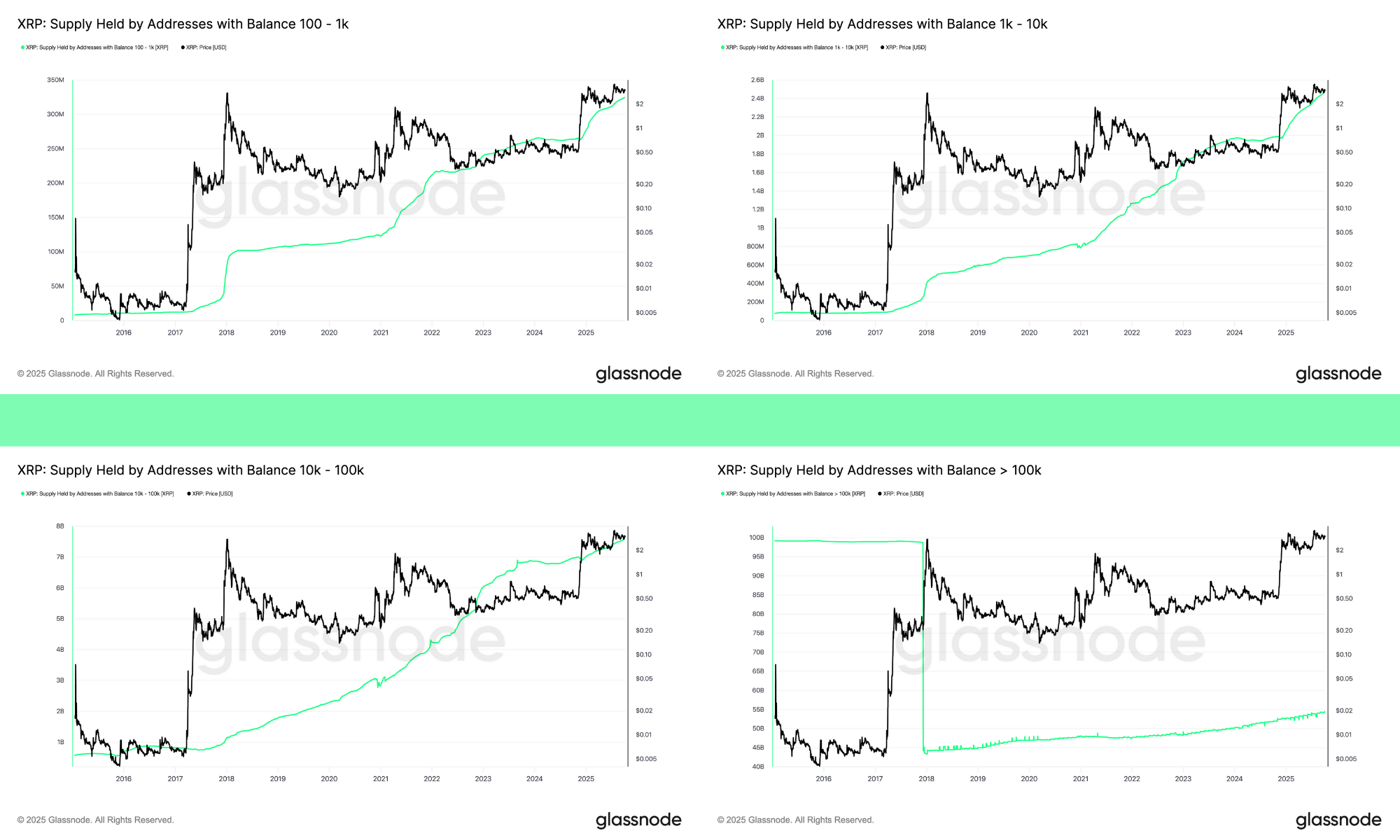 链上数据进一步强化看涨预期,Glassnode报告显示:在近期震荡整理阶段,持有10枚至10万枚以上XRP的实体持仓量持续增长。持有10-10万+XRP的地址供应量 数据来源:Glassnode