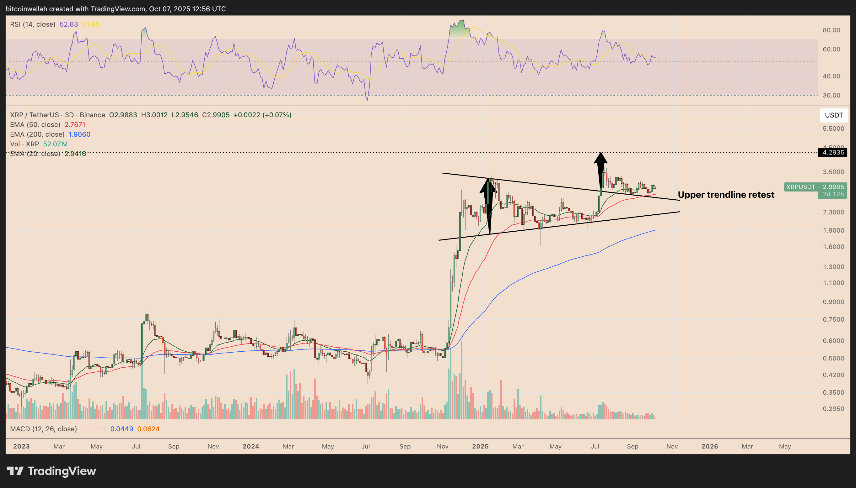 图表分析显示,XRP当前正在确认对称三角形形态的突破。价格近期对突破位进行经典"回踩测试",若确认有效,可能推动XRP涨至4.29美元目标位,较现价潜在涨幅约45%。XRP/USD三日价格图表 来源:TradingView