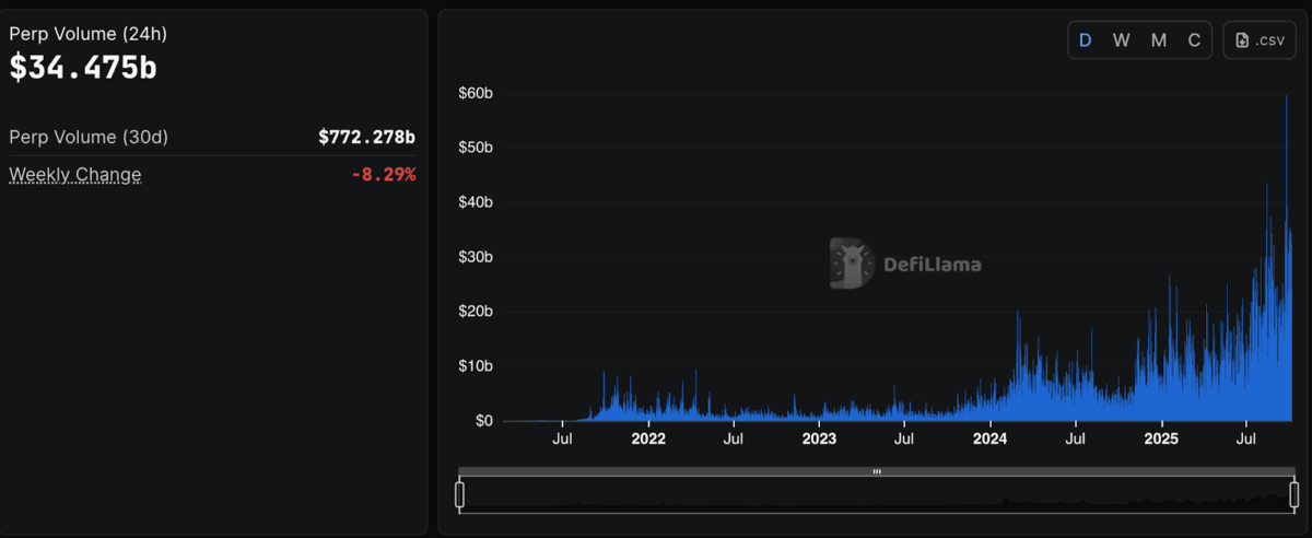 DeFiLlama数据显示永续合约交易量激增,24小时内交易额达344.75亿美元。过去30天累计交易量达7,722.8亿美元。但周数据显示-8.29%的跌幅,表明市场热情短期降温。