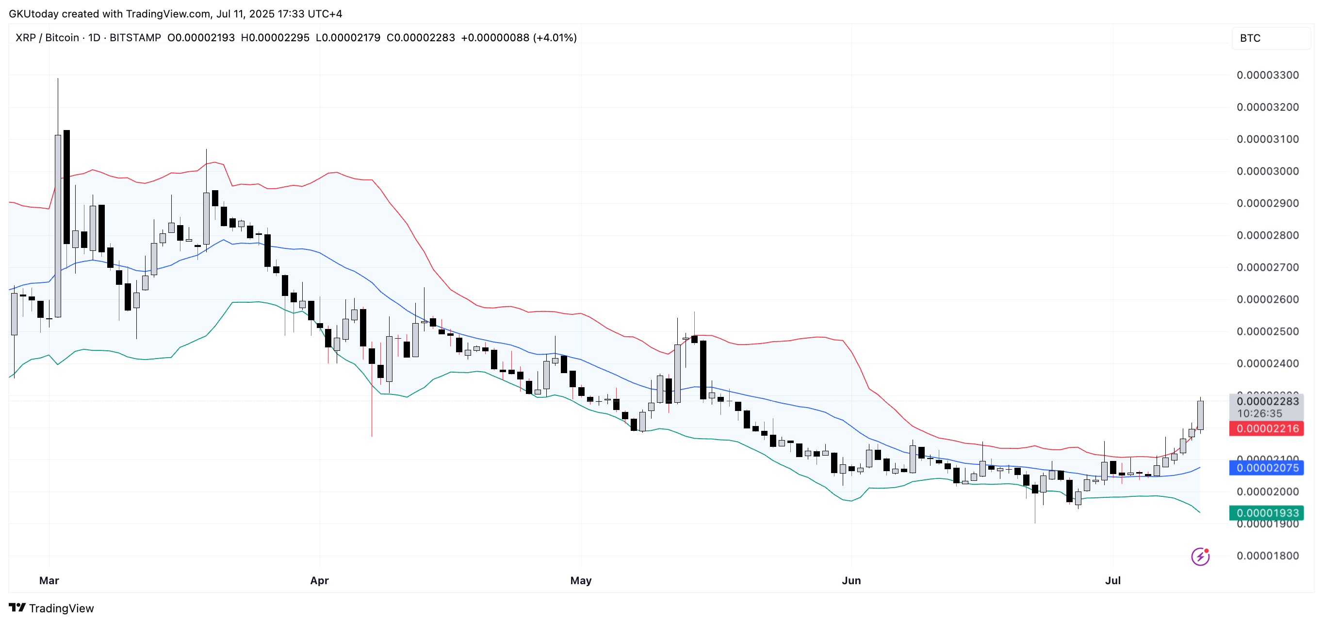 经过数月的低波动震荡和逐渐消退的市场兴趣,XRP终于突破了一个真正关键的水平——而且是以其主要的对手币比特币作为计价基准。在日线时间框架上,XRP/BTC交易对自三月份以来首次以完整蜡烛形态收于布林带上轨上方。