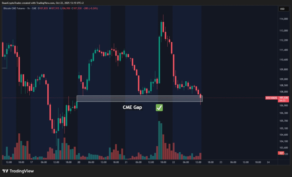 比特币近日已回补位于10.7万美元关口附近的CME价格缺口。该缺口源于芝加哥商品交易所周末休市与重新开市时的价格跳空现象,这类缺口通常会被快速回补,因而成为交易者重点关注区域。