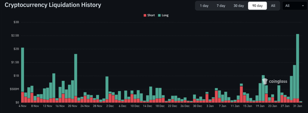 若在持续的大户抛售压力下失守2200美元支撑,以太坊可能进一步跌向1700-1800美元区间。倘若在未来几个交易时段内重新收复2500美元阻力位,则可能出现10%至15%的反弹。由于大户抛售与ETF资金外流加剧损失,过去24小时内爆仓金额超过25亿美元。