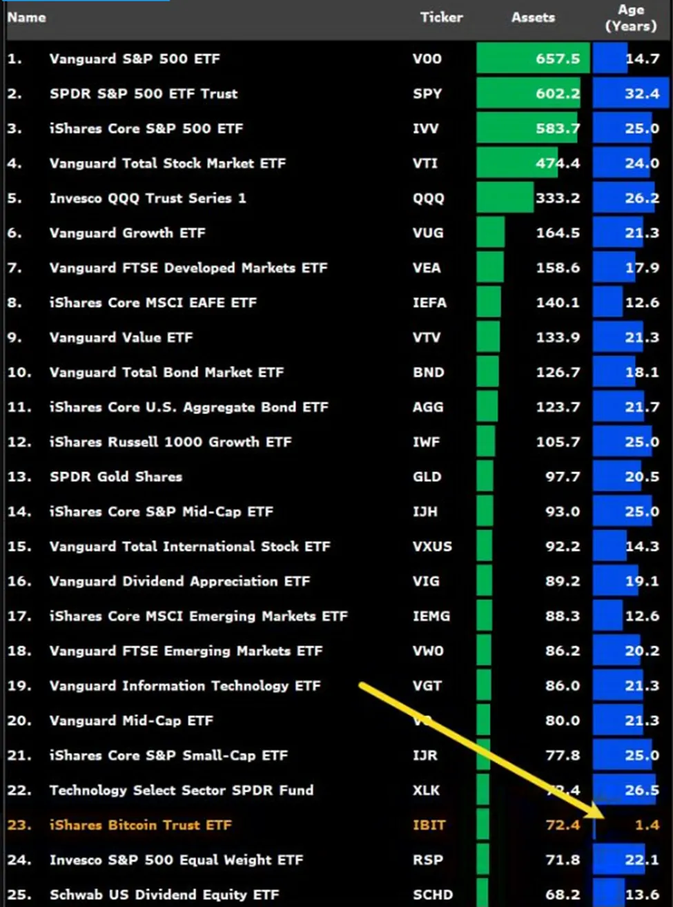目前IBIT以每月4万枚(约每日1300枚)的速度持续增持。若保持该增速,这支成立仅1.4年的ETF有望在2026年5月——即推出两年后——完成对中本聪持仓的超越。如此迅猛的发展使IBIT成为全球资产管理规模前25ETF中最年轻的成员。