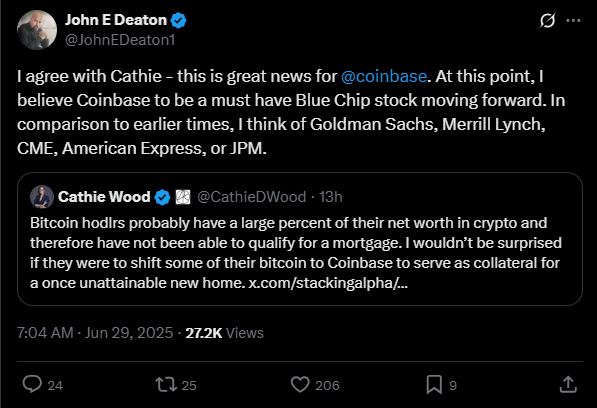 支持瑞波币的律师John Deaton将Coinbase称为"必备蓝筹股",并将其与华尔街巨头高盛、摩根大通和美国运通归为同类。Deaton指出,Coinbase的规模、市值及日益增长的机构影响力使其配得上新地位。目前高盛和摩根大通的市值超过4000亿美元,而Coinbase市值已突破1000亿美元。