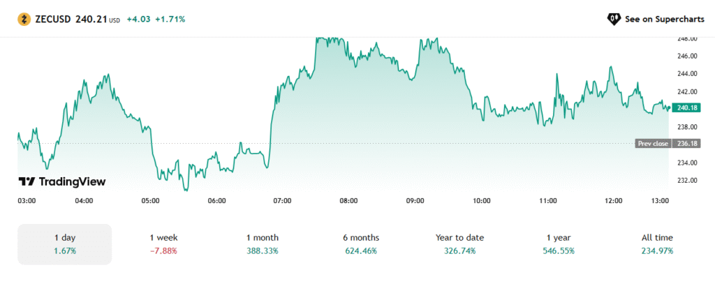 Zcash(ZEC)近期交易时段上涨1.71%,最终收于240.21美元,走势稳健并稳定维持在230美元支撑位上方。该代币宣布实现388%的月增长和624%的六个月涨幅,彰显其在加密市场整体复苏中的持续强势。凭借326%的年内增长率,这个领先的隐私币项目正超越同类竞争者。