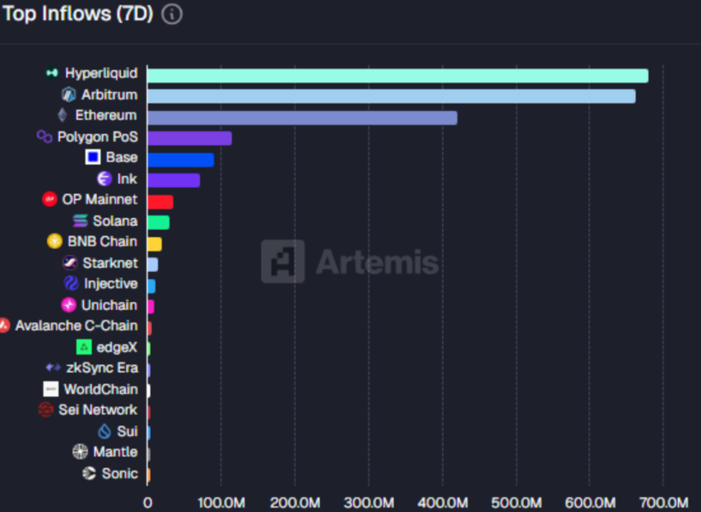 支持当前Hyperliquid价格预期前景的最大催化剂之一是进入其生态系统的资金急剧增加。根据区块链分析平台Artemis的数据,Hyperliquid在过去一周录得约6.8亿美元的净流入,使其成为该期间资本增长方面表现最好的区块链网络。