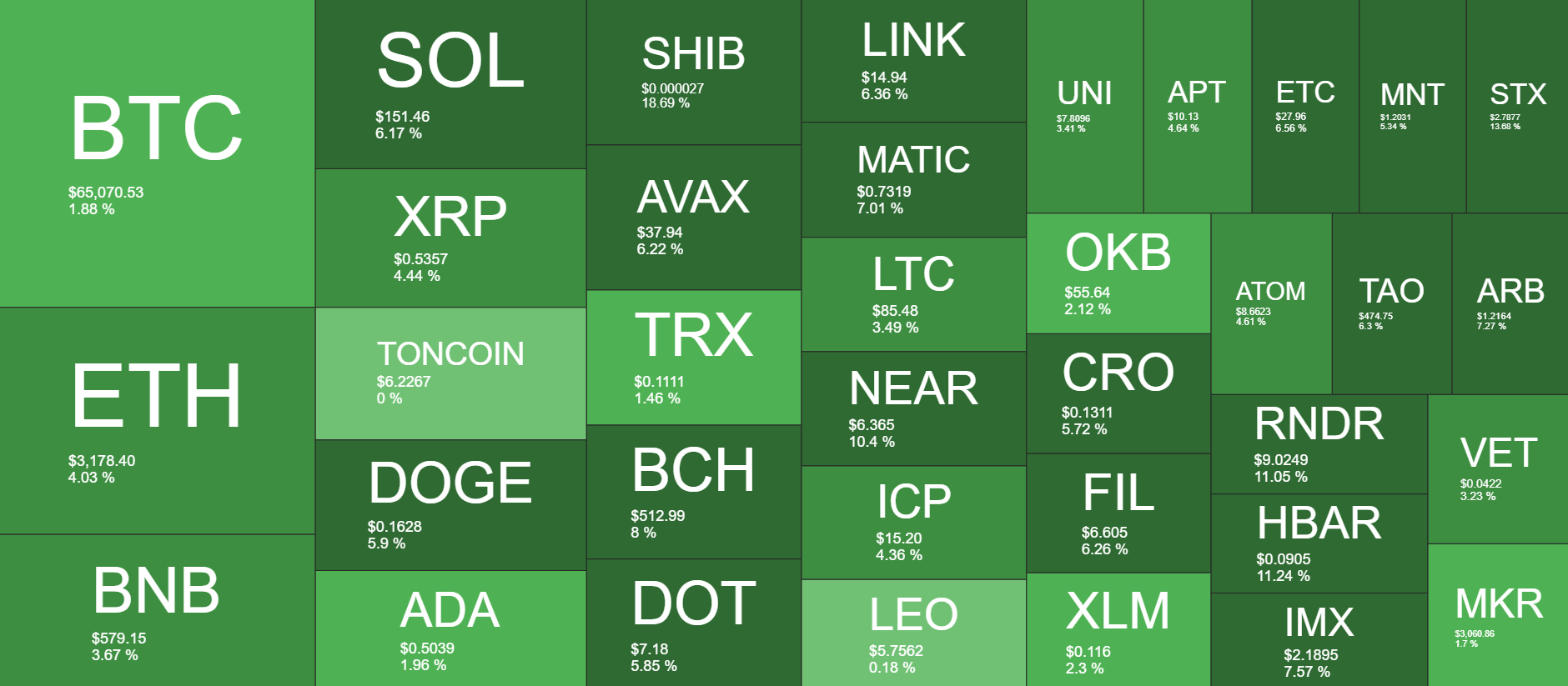 在经历了近期的大幅波动后,比特币价格持续回升,目前已攀升至约65,000美元。与此同时,山寨币的表现更为亮眼,其中以太坊(ETH)和币安币(BNB)均上涨约4%,而柴犬币(SHIB)更是抢尽风头。