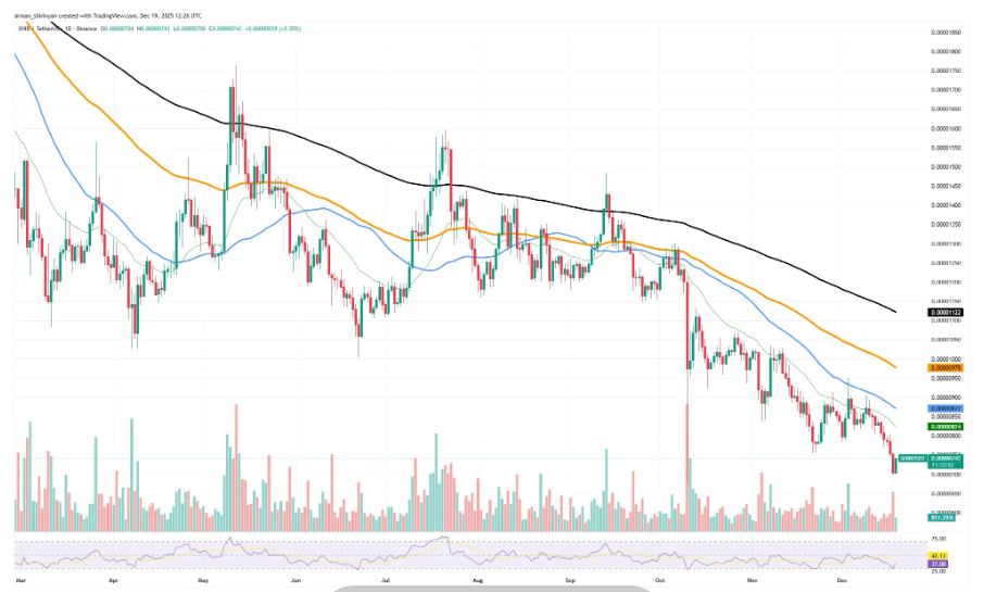 Shiba Inu 仍处于主要日移动平均线下方,确认了其在更广泛下跌趋势中的持续地位。