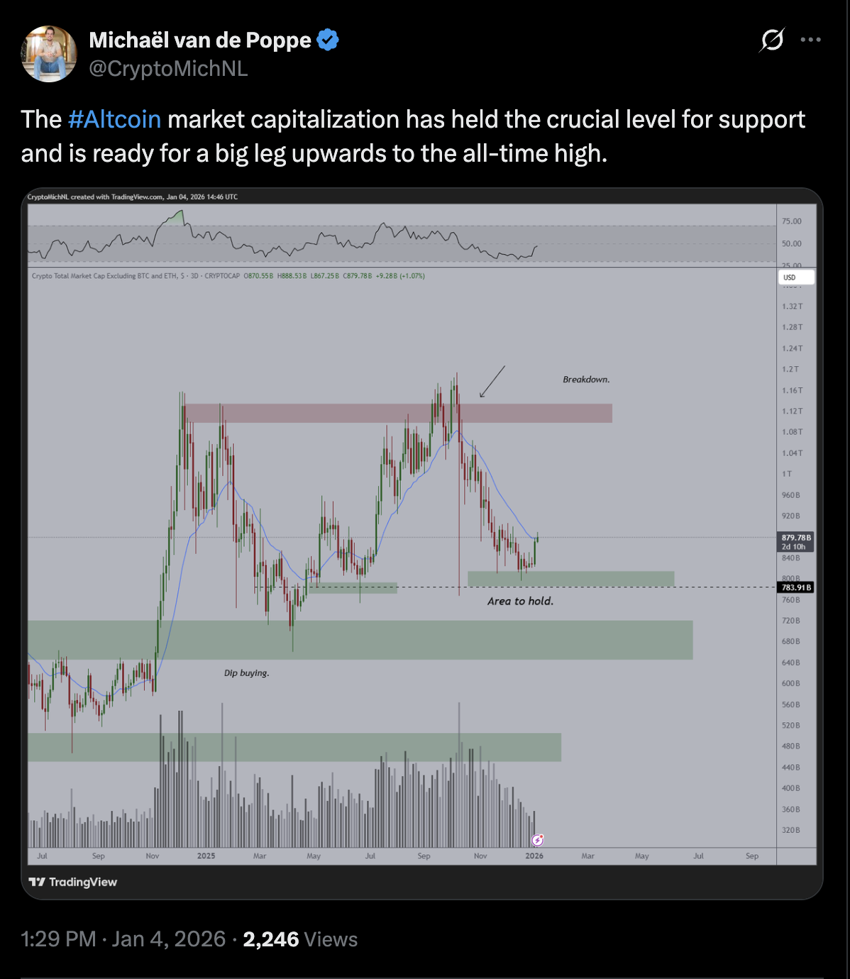截至本文撰写时,山寨币市场估值已突破8790亿美元。加密货币交易员兼市场分析师迈克尔·范德波普指出,该市场正蓄势待发,即将向此前近1.2万亿美元的历史峰值发起新一轮冲击。