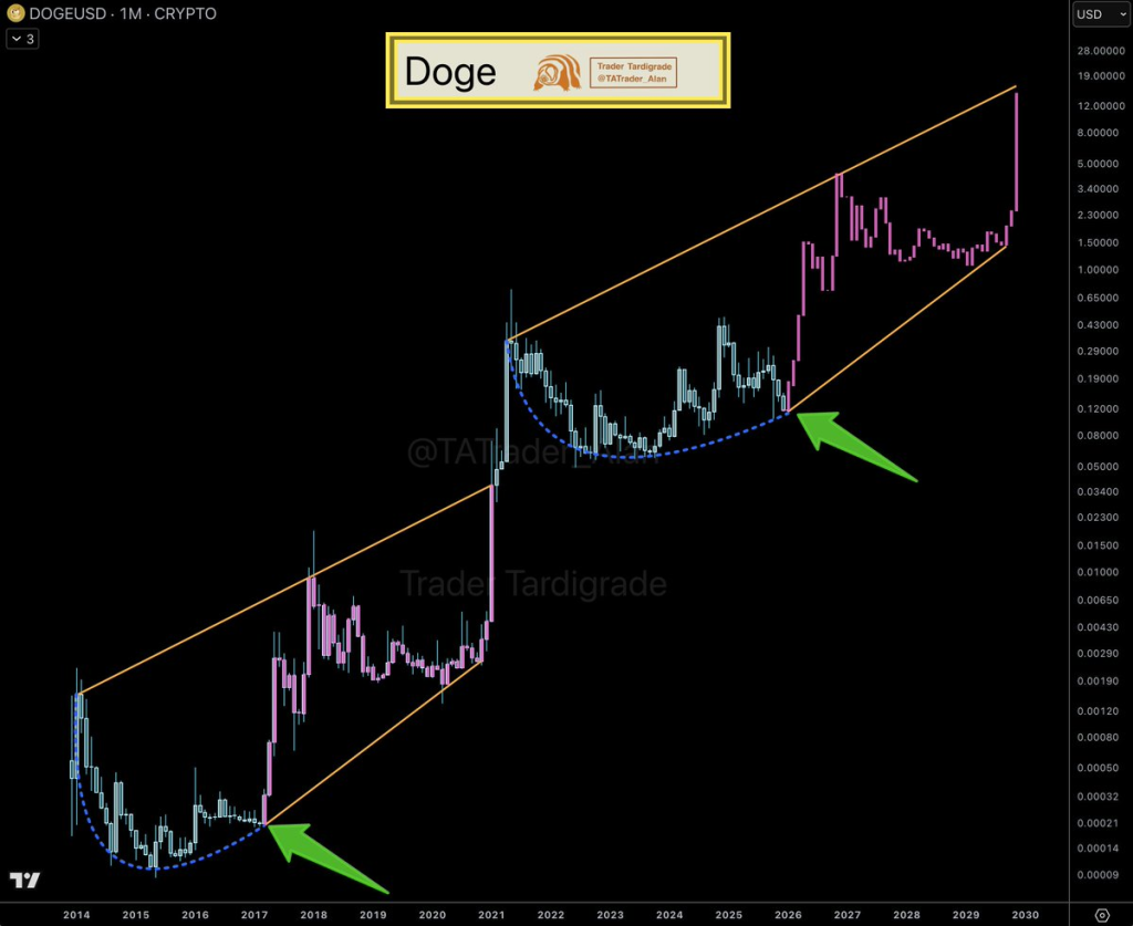 交易员Trader Tardigrade近期发布的一张狗狗币图表因其与过往市场周期的相似性而引发关注。从月度尺度看,当前的走势结构与2017年及2021年大涨前的形态颇为相似。在这两个周期中,DOGE均经历了以圆弧底为标志的漫长积累期,该形态最终均引发了价格的急剧突破。