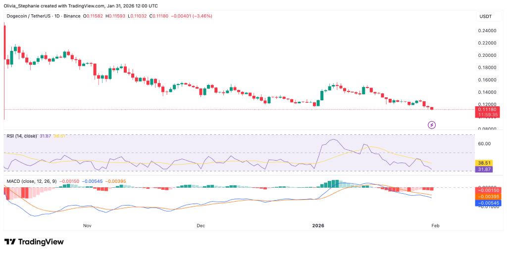 狗狗币价格徘徊在0.112美元附近,过去一周跌幅约10%。日内走势亦保持负向,图表上可见的买盘压力微弱。