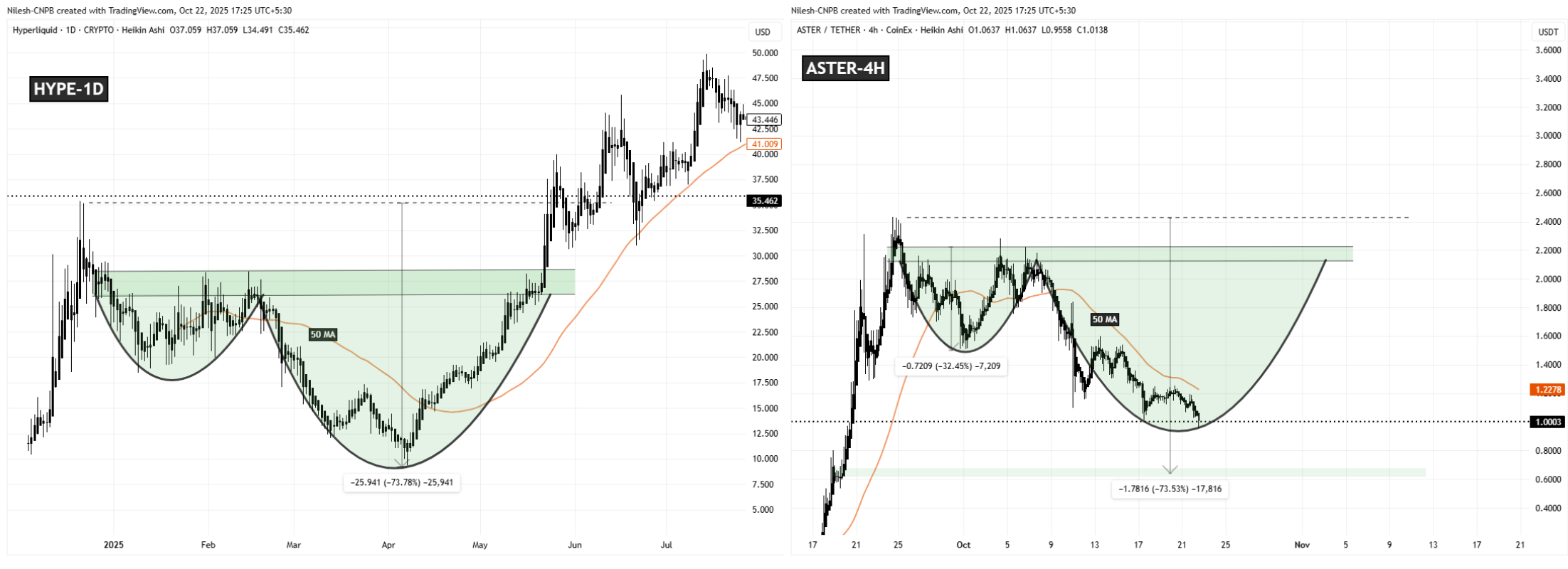 图表显示,ASTER近期价格走势与HYPE在2025年4月的结构开始呈现显著相似性。彼时HYPE在创下35.37美元历史高点后进入深度调整阶段,形成经典圆弧底形态。该代币从峰值下跌约73%后触底,当重新站上50日均线时,动能转为看涨,最终实现颈线突破并开启强势回升。
