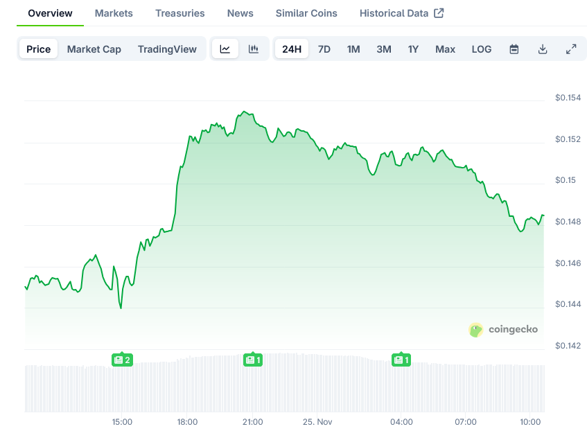 狗狗币近日从0.1330美元区间启动反弹,先后突破0.140和0.1420美元阻力位,但目前在0.1530-0.1540美元区间遭遇阻力,小时图上正在形成看跌趋势线。截至发稿,狗狗币交易于0.152美元附近,现货与衍生品市场24小时总交易量达19.3亿美元。