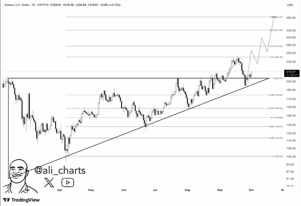 从图表结构可见,Solana自四月初以来始终受到上升趋势线的稳固支撑。六月期间价格围绕160美元震荡,八月开始显著攀升,九月更是一度突破250美元关口,在回调前展现出强劲的韧性测试。Ali的延伸分析指出,根据斐波那契目标位测算,后续可能触及320-360美元区间。只要当前上升趋势延续,该预测目标具备现实可能性。