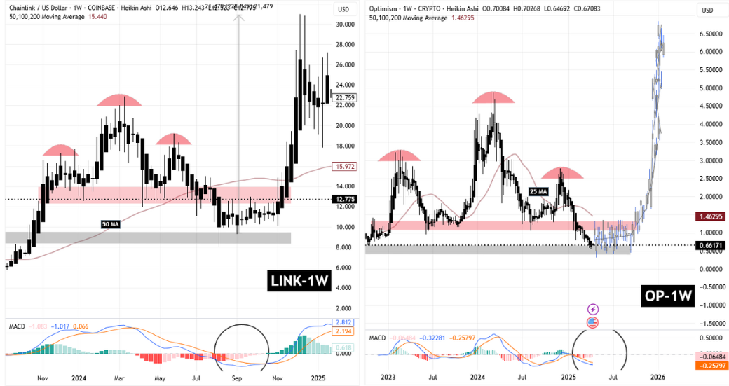 从周线图来看,OP似乎正在追踪与Chainlink(LINK)在2024年末爆发性上涨前相似的分形模式。