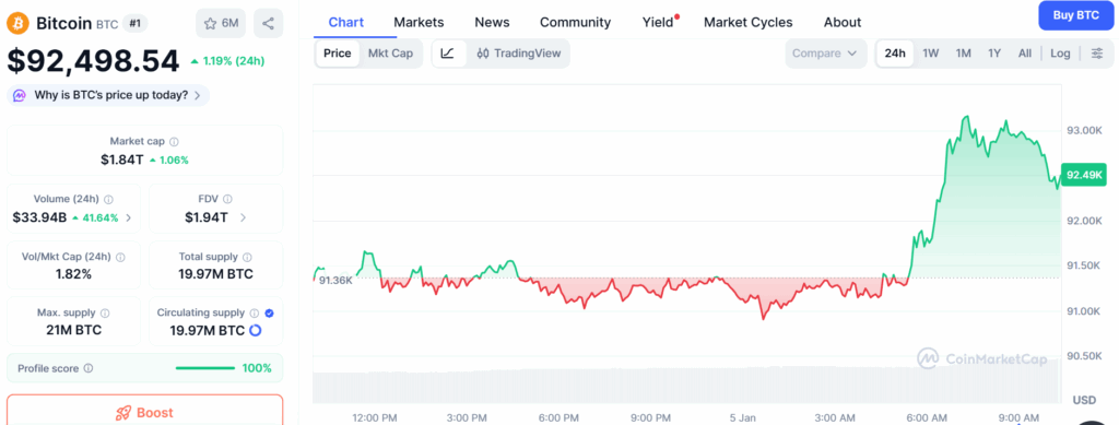 比特币现报92,498.54美元,24小时涨幅1.19%,周涨幅达2.81%。此前9万美元关口被视为旗舰加密货币的关键测试区域,其突破可能成为牛市启动信号。比特币价格上涨之际,全球加密货币总市值同步增长1.42%,目前突破3万亿美元大关。
